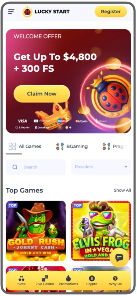 As a mobile optimized site, our LuckyStart casino has the same interface, gaming options, banking methods and bonuses regardless of which device you’re using. You can use Visa, Mastercard, Interac or cryptocurrencies like BTC, ETH, USDT and many others to manage your gaming budget from phone or PC.