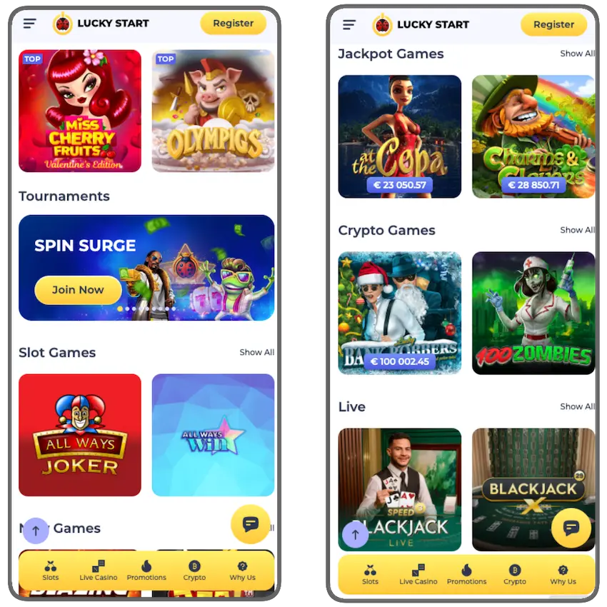 The Casino LuckyStart app looks exactly the same as our casino site, with the light background and our lucky ladybug icon. We deliberately optimized the site in a way that PC players can play on mobile with no extra effort and vice versa. You’ll find your profile at the top left, the “Deposit” shortcut just below it, quick access buttons for games and promos on the sidebar, and a lobby packed with over 3,500 games when you log into your profile from a smartphone or tablet. Games will also look identical, meaning you’ll find the spin buttons, bet size sliders, bonus buy options, jackpot bars and all other features in their usual spots.